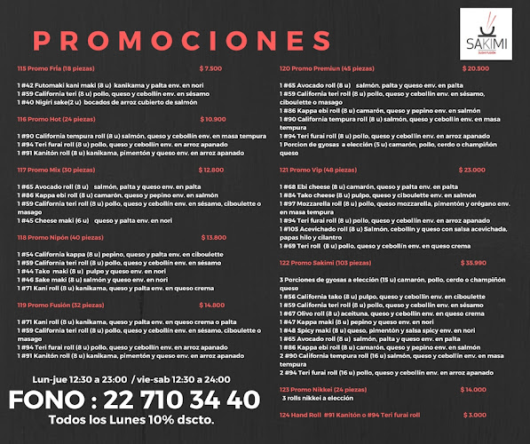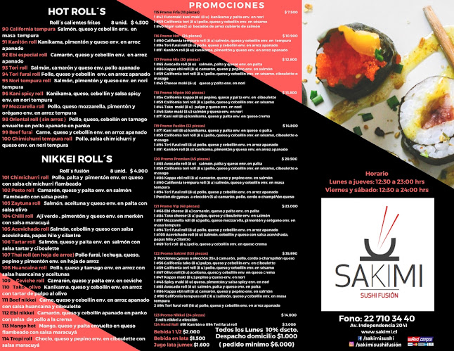 Horarios de apertura de Sakimi Sushi Fusion - Restaurante Nikkei Independencia (Comida Japonesa - Thai - Peruana)